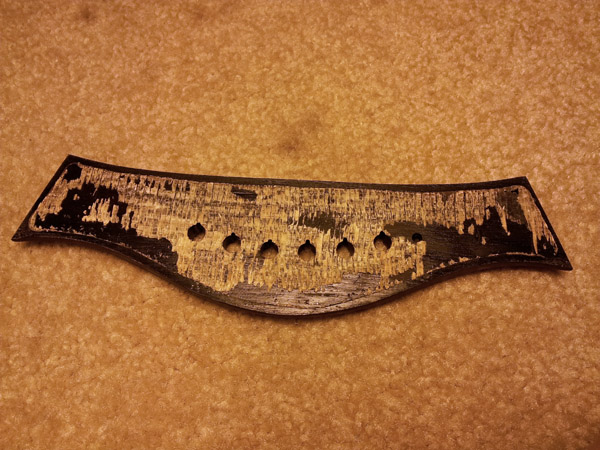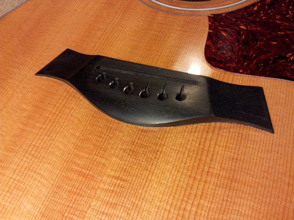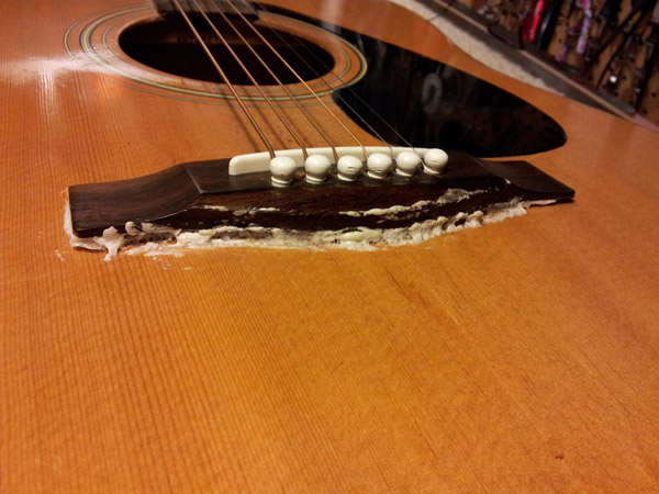 In this perspective you can see a  properly prepared top gluing surface to the left side. On the right  side of the bridge "outline", you can clearly see how  Taylor glued the bridge to a slightly smaller version of the bridges  approximate footprint. The thickness of the finish itself, obstructed  proper contact when they clamped it from the factory. If they used a  little more glue to fill the gap better that would of helped.