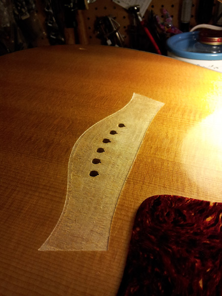 This is how a professionally prepared  top should look before the bridge is glued on. A perfect outline of  the bridge itself. In fact the bridge is slightly "inlaid"  into the instrument since the entire thickness of the finish has been  removed.