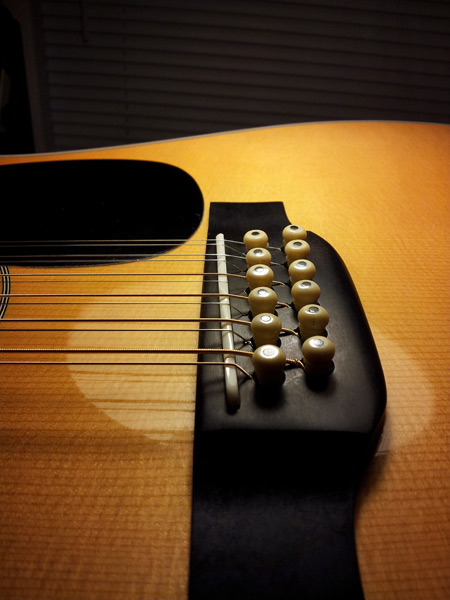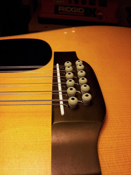 This first picture is from a Martin  D-12-28 with its original saddle. Notice the top of the saddle is  simply half-round, like a fret. This original saddle is made from  Micarta, a lightweight synthetic material that Martin Guitars used  for years and years. It is not a very good sounding material when  compared to bone.