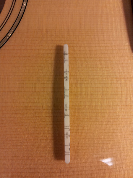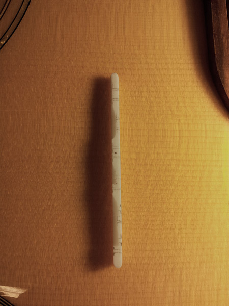This is a view of the top of an unshaped 12 string saddle, with the appropriate markings for proper intonation and each strings scale length.