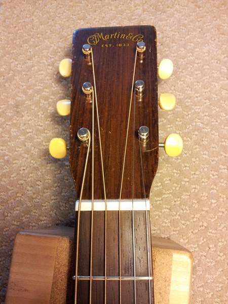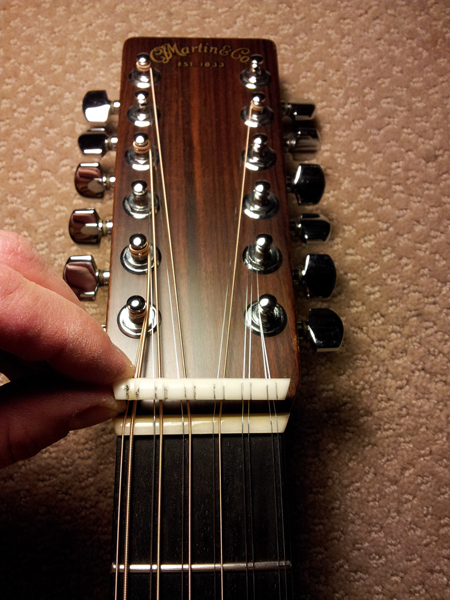 In this perspective I'm holding the old  nut above the upgraded nut to contrast the string/course spacing. The  string spacing of the installed upgraded nut has an overall wider  string spacing from 1st to 6th. However each individual pair of  strings is spaced significantly closer. The result is that each pair  is more obvious to the hand. When the space between each pair is too  wide, it feels confusing, imprecise and unpredictable to play. As if  there were 12 individual strings instead of 6 pairs.